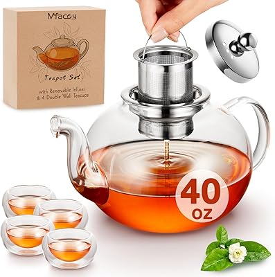Large Glass Teapot Set, TeaPot 40 OZ1200ml with 4 Double Wall Teacups & Removable Stainless Steel Infuser, Stovetop Safe Tea Kettle, Blooming & Loose Leaf Tea Maker Set, Microwave Dishwasher Safe